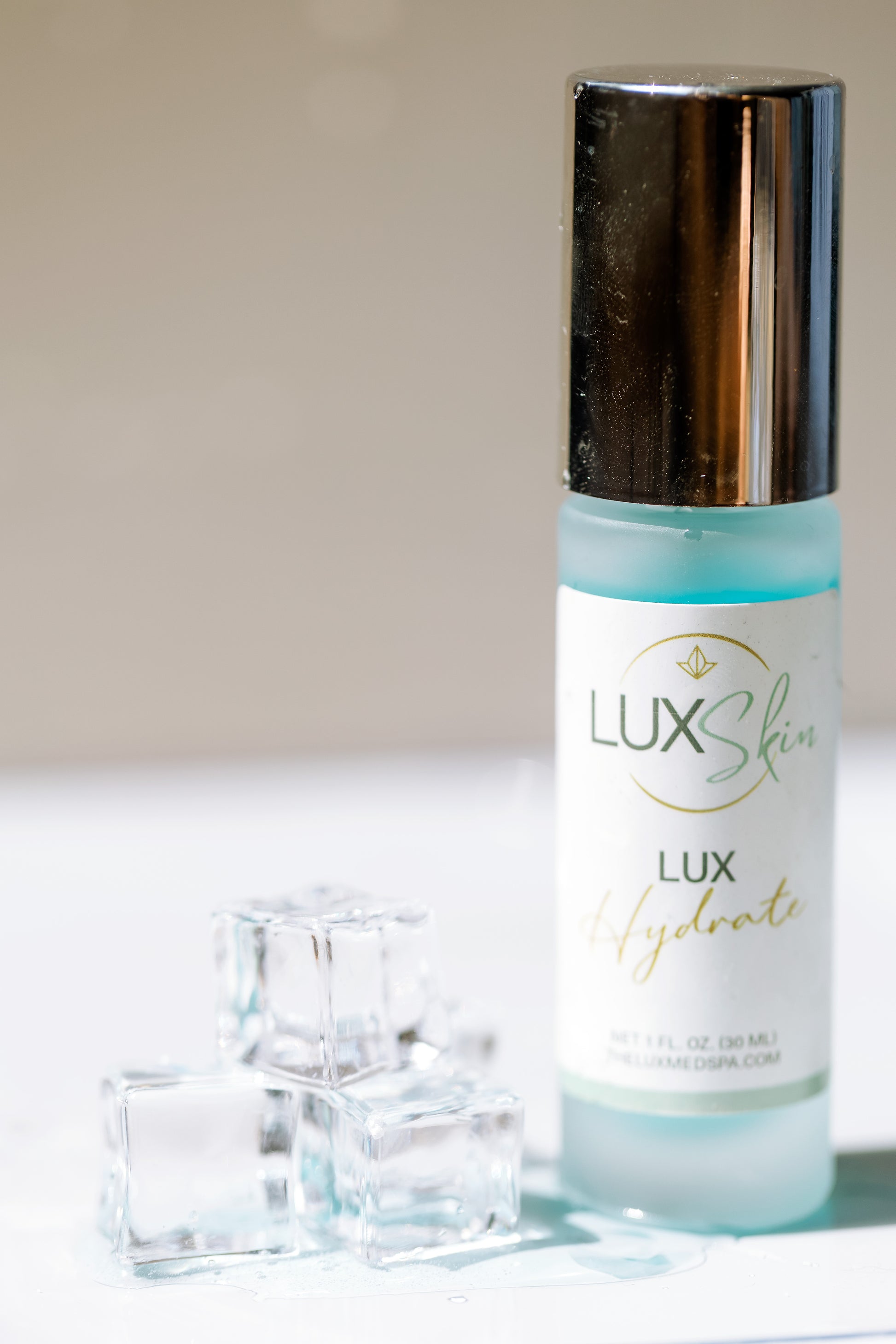 LUX Hydrate penetrates deeply with fractionated hyaluronic acid to draw and lock in moisture. White tea, glutathione, and zinc/copper peptides repair the skin barrier, brighten tone, and improve elasticity.